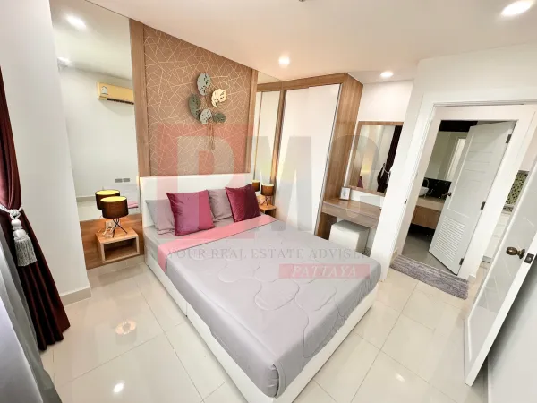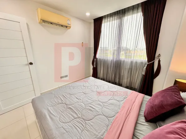 Városra néző lakás kiadó Jomtien területén, mindössze 600 méterre a strandtól és 10 percre autóval Central Pattayától. Kiváló elhelyezkedés, közlekedési lehetőségekkel, helyi piaccal, 7/11 üzletekkel, éttermekkel és sok mással. Az épületkomplexum 24 órás biztonsági szolgálattal, kulcskártyás beléptetőrendszerrel, CCTV kamerával, recepcióval, közös üdülő stílusú medencével, edzőteremmel és taxi szolgáltatással rendelkezik. A lakás egy 35 négyzetméteres, 1 hálószobás saroklakás, amely az 5. emeleten található. A lakás frissen festett és jól karbantartott. Nagysebességű internetkapcsolattal rendelkezik.